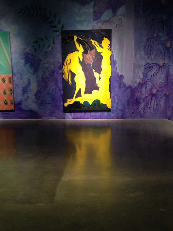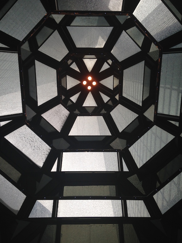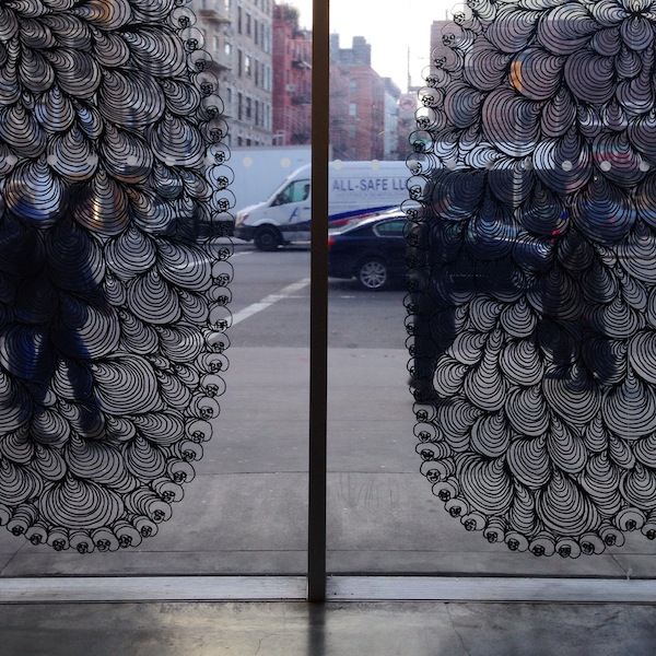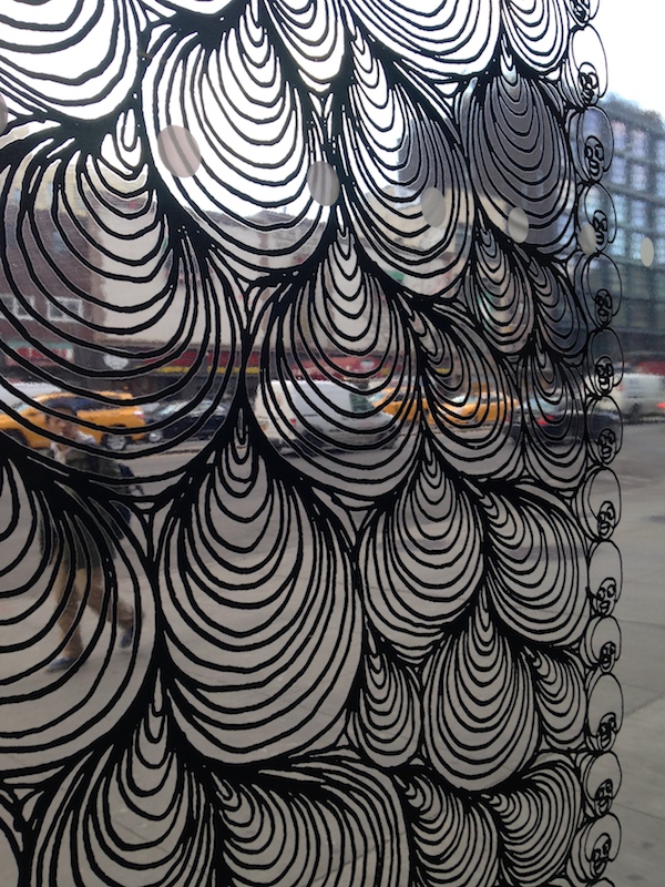 It’s been quite a while since I’ve been to the New Museum, and I wanted to catch the Chris Ofili exhibit before it closed on February 1. I took only a few photographs of the exhibit because it left me underwhelmed. The new paintings seemed thin and derivative — if you create a dark room with dark paintings, they had better have the power of the Rothko Chapel — and the figural shapes reminded me of German Expressionism, but without the added richness and layering of Ofili’s earlier work with sequins, collage, and elephant dung. I did like some of the drawings, one photographed here, that were transformed into films for the big windows on the museum’s first floor. Their aqueous shapes made a nice commentary on the museum’s metal carapace. In general I thought the architecture was looking a little sad. Dirty whites, paint-crusted metal edges, the incessant dinging and scraping of the elevator in that supposedly contemplative gallery. I’ve always liked the SANAA building conceptually, but its simplicity needs upkeep.