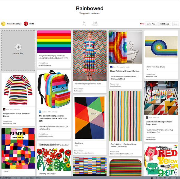 Noticed: A revival of a trend that I associate with the 1980s, rainbows! In decor, in architecture, in fashion, and a perpetual interest of children’s book authors. I rounded up a few of the most stylish examples on a Pinterest board, and will keep adding as I see more. Something I can’t find, but someone who does screenprinting should make, is a simple navy sweatshirt with a ROYGBIV arc on the front. There’s a market.